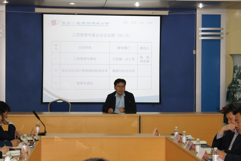 ? ? ? 4月13日,青島一建集團在多功能廳召開工程管理專題會。集團總裁助理以上領(lǐng)導,各單位負責人,質(zhì)量安全技術(shù)分管領(lǐng)導,總部職能部門負責人,項目經(jīng)理共60余人出席了本次會議。