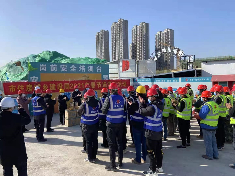 近日,青島市住房城鄉(xiāng)建設(shè)局副局長蒲一江帶隊來到一建集團承建的市北區(qū)同安二路小學(xué)項目開展春節(jié)前“送溫暖”活動。為奮戰(zhàn)在一線的施工人員送上米面油等慰問品,向他們長時間堅守一線,辛苦工作為青島城市發(fā)展作出的貢獻表示感謝,祝愿他們過一個幸福美滿的新年。